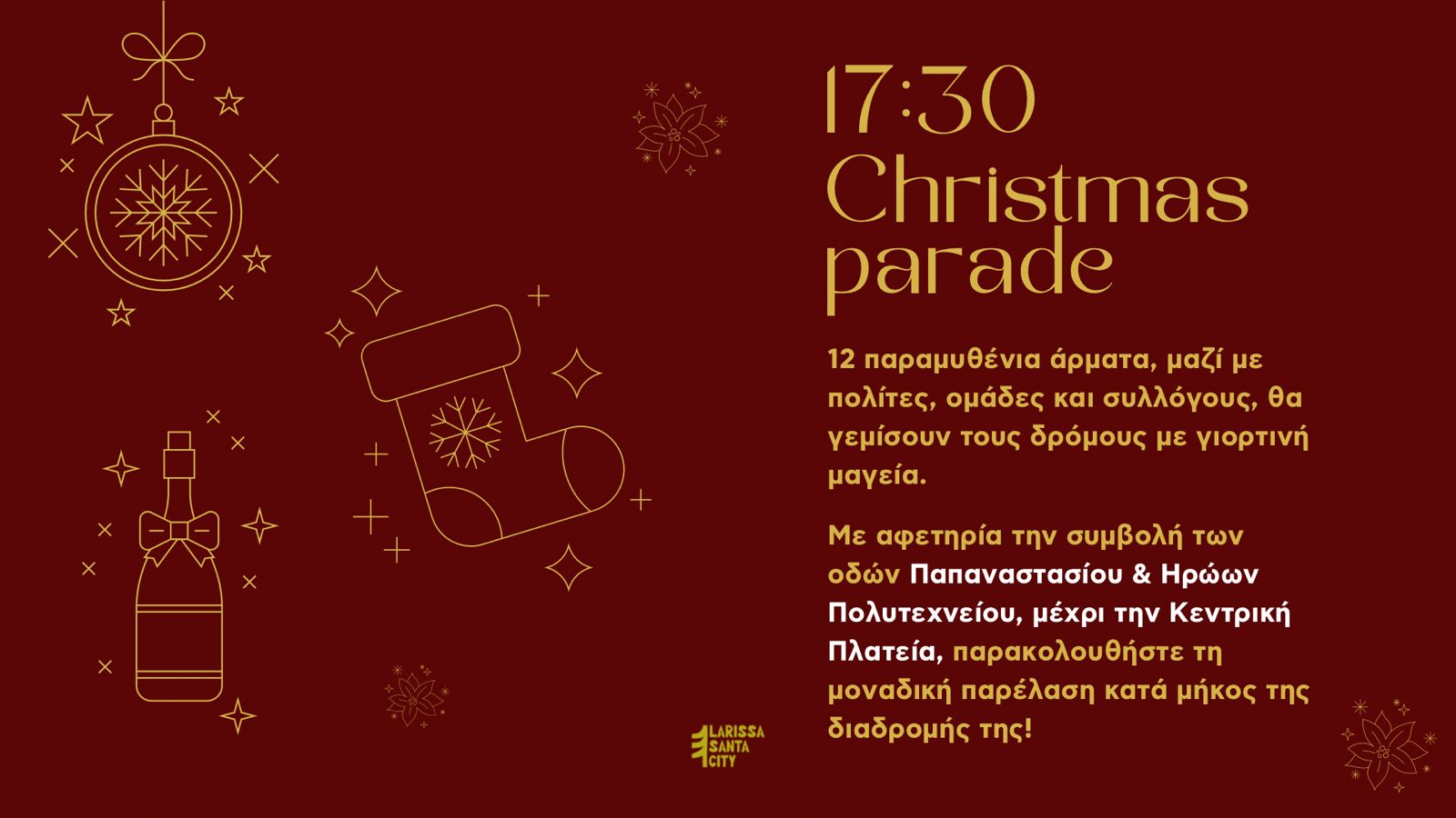 To Christmas Parade, η χριστουγεννιάτικη παρέλαση αρμάτων είναι ένα μοναδικό υπερθέαμα, που μεταμορφώνει τη Λάρισα στον απόλυτο προορισμό για τις γιορτές. Μια παρέλαση 12 πολύχρωμων, φαντασμαγορικών αρμάτων, με περισσότερους από 1000 συμμετέχοντες αναμένεται να κατακλύσει την «καρδιά» της Λάρισας, υπό το «πρόσταγμα» του αγαπημένου Χρήστου Φερεντίνου, που έχει αναλάβει την παρουσίαση της εκδήλωσης.