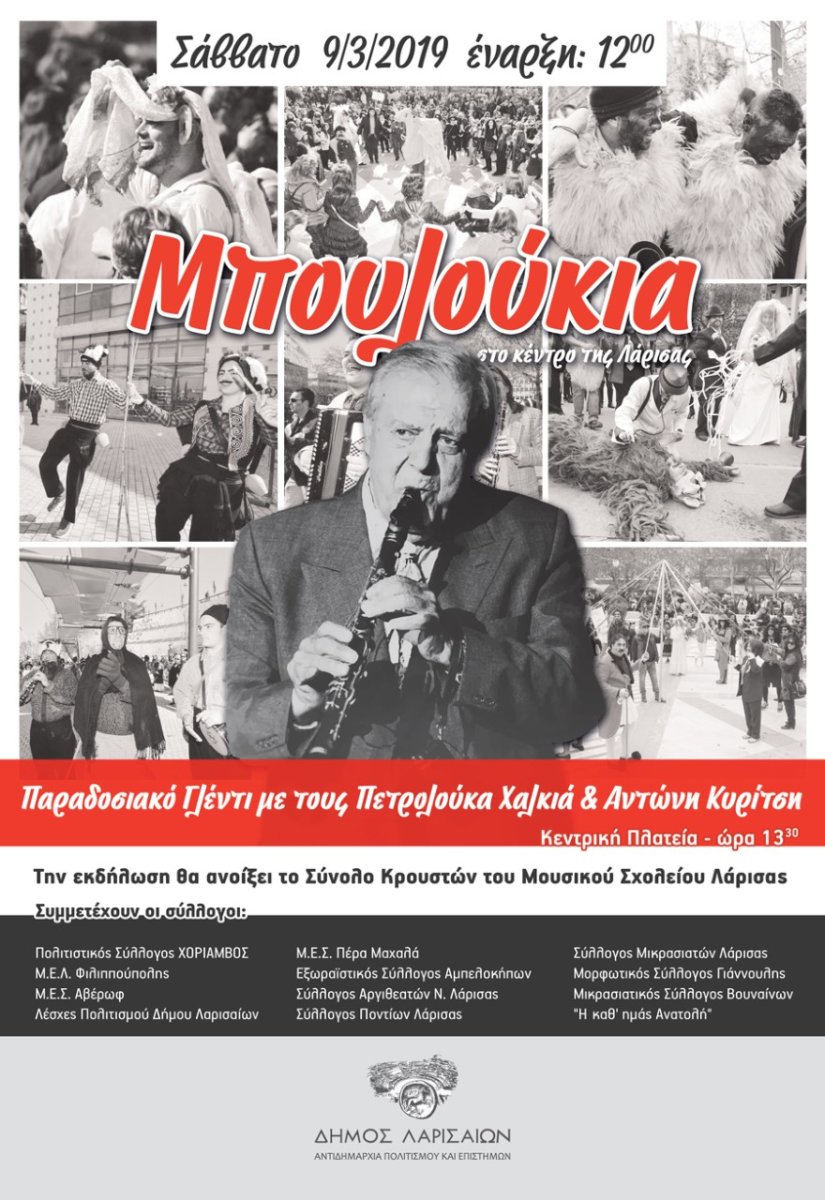 Με μπουλούκια θα γιορταστεί και οι φέτος, για πέμπτη χρονιά, το Σάββατο της Τρανής Αποκριάς (9 Μαρτίου 2019) στη Λάρισα, αλλά και με μεγάλο γλέντι, με τον βιρτουόζο του κλαρίνου Πετρολούκα Χαλκιά, τον κορυφαίο ερμηνευτή του παραδοσιακού τραγουδιού Αντώνη Κυρίτση και επταμελή κομπανία.
