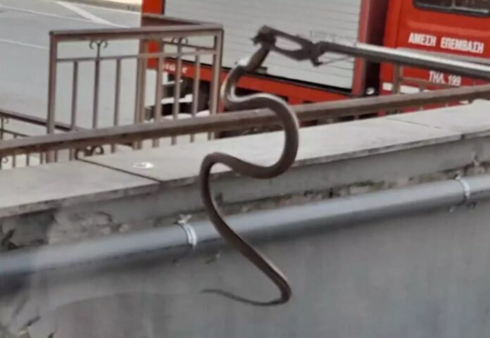 Άμεσα ειδοποιήθηκε η Πυροσβεστική Υπηρεσία Λάρισας που απομάκρυνε το – άκακο – φίδι από το χώρο για να το απελευθερώσει στο φυσικό του περιβάλλον.