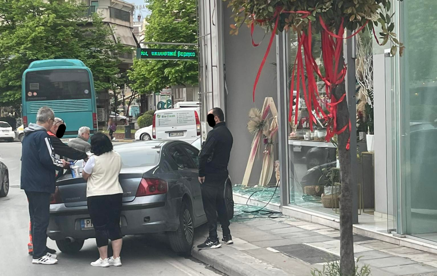 Στο συγκεκριμένο σημείο αυτοκίνητο, υπό άγνωστες συνθήκες, βρέθηκε σε τζαμαρία καταστήματος, την οποία και θρυμμάτισε.