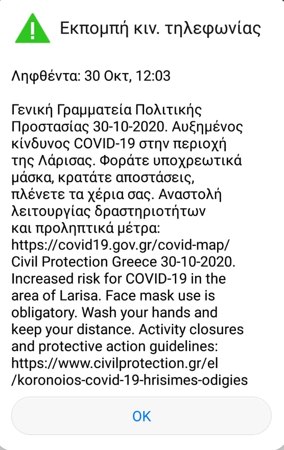 Μαζικά μηνύματα στα κινητά τηλέφωνα των κατοίκων της Περιφερειακής Ενότητας Λάρισας απέστειλε πριν από λίγα λεπτά η Γενική Γραμματεία Πολιτικής Προστασίας ενημερώνοντάς τους για τον αυξημένο κίνδυνο λόγω κορωνοϊού.