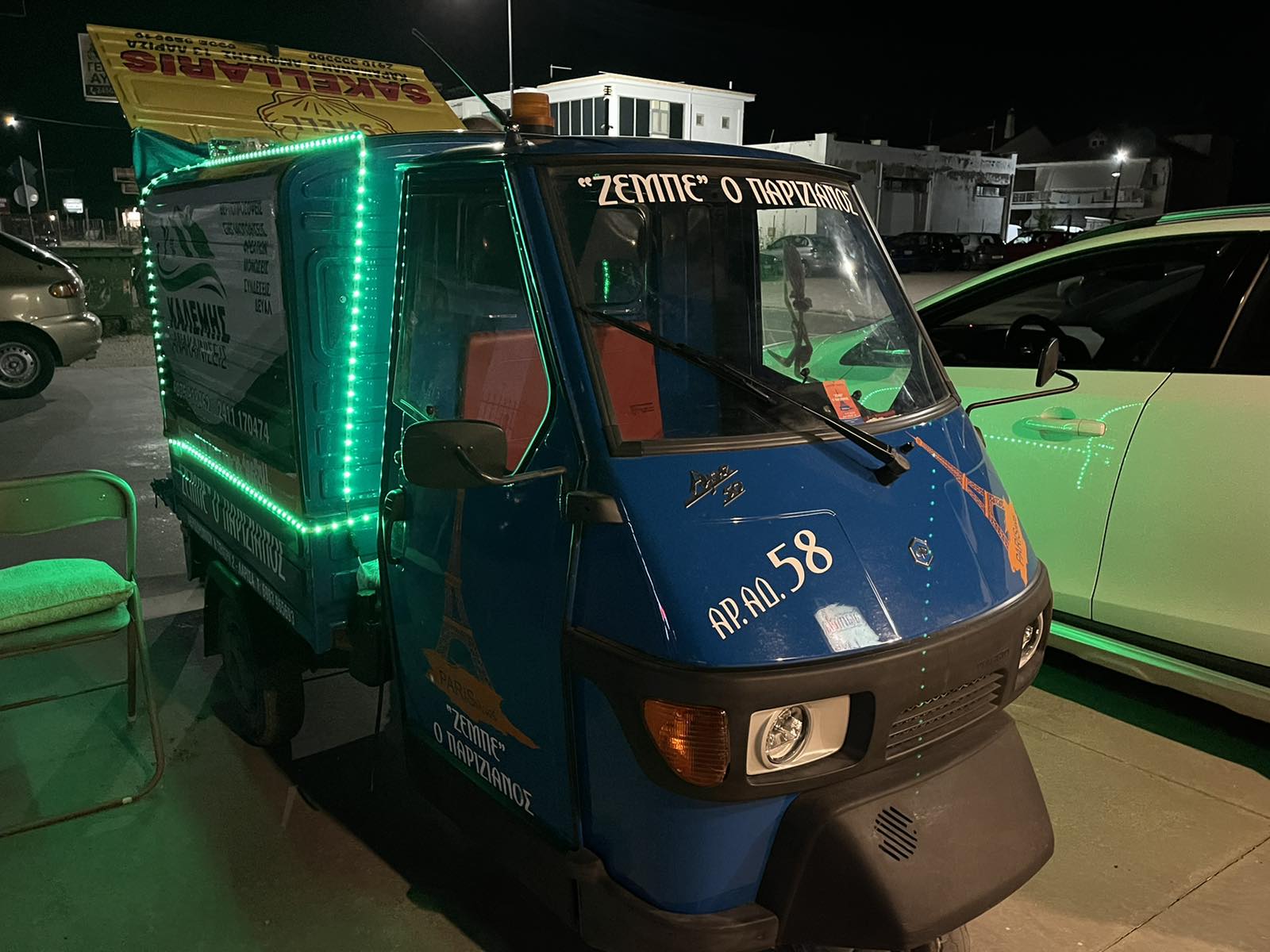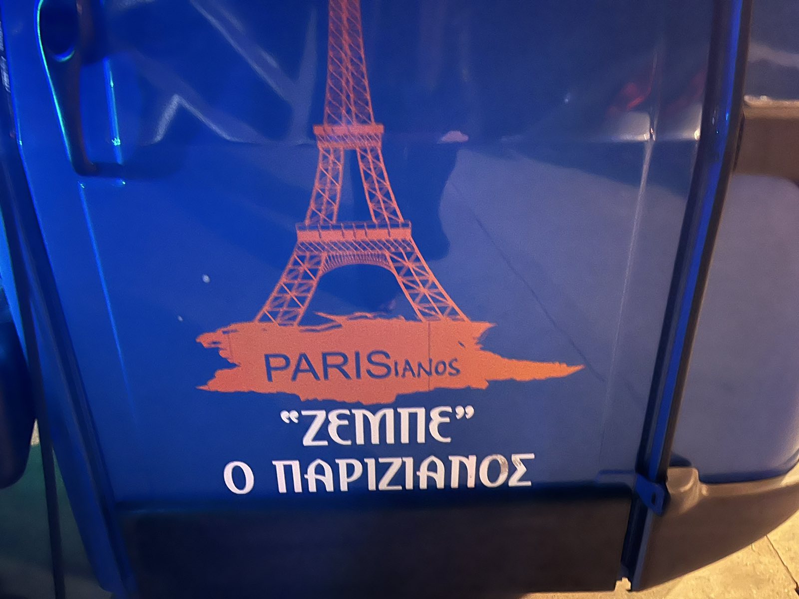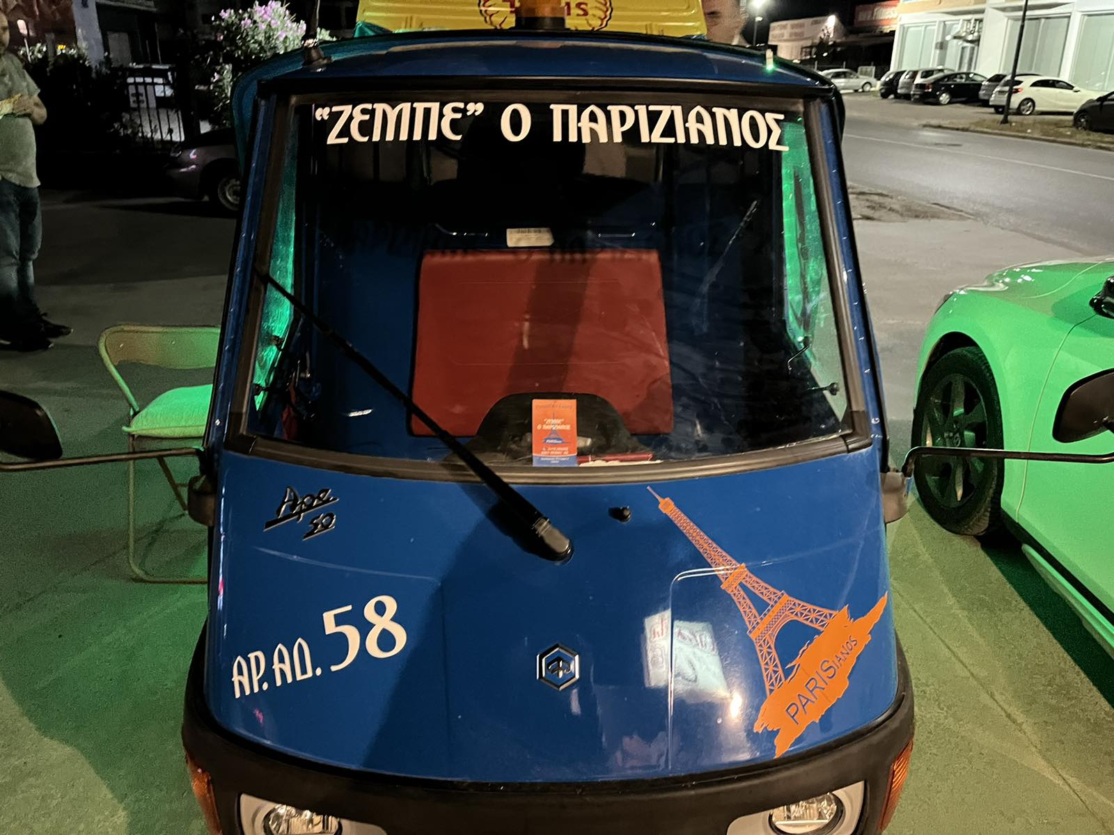 Το τρίκυκλό του το οποίο το ανακαίνισε τα τελευταία χρόνια και πλέον μοιάζει με … εξωγήινο όχημα, κοσμείται από το brand της εταιρείας, το οποίο είναι “Ζέμπε ο Παριζιάνος”. Γιατί άραγε Παριζιάνος; Μα διότι λατρεύει το Παρίσι, αν και ακόμη δεν έχει καταφέρει να πάει στην πρωτεύουσα της Γαλλίας παρότι όπως μας τονίζει, οι δουλειές πάνε καλά.