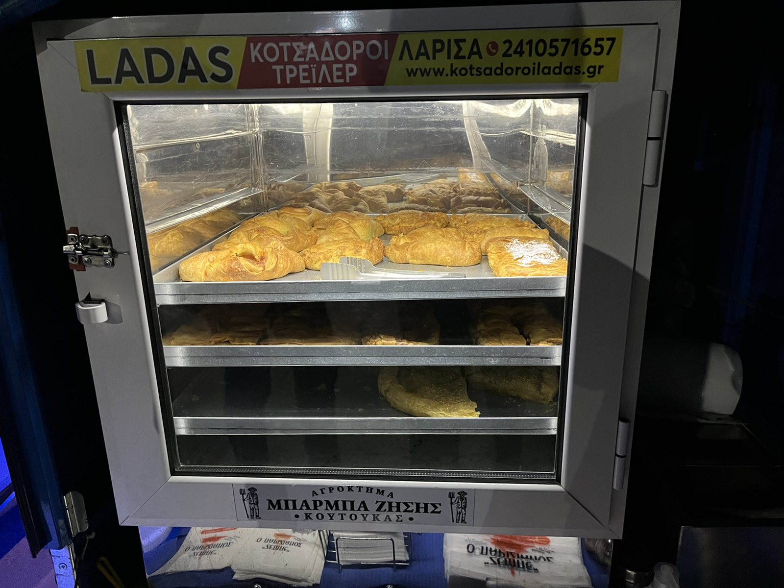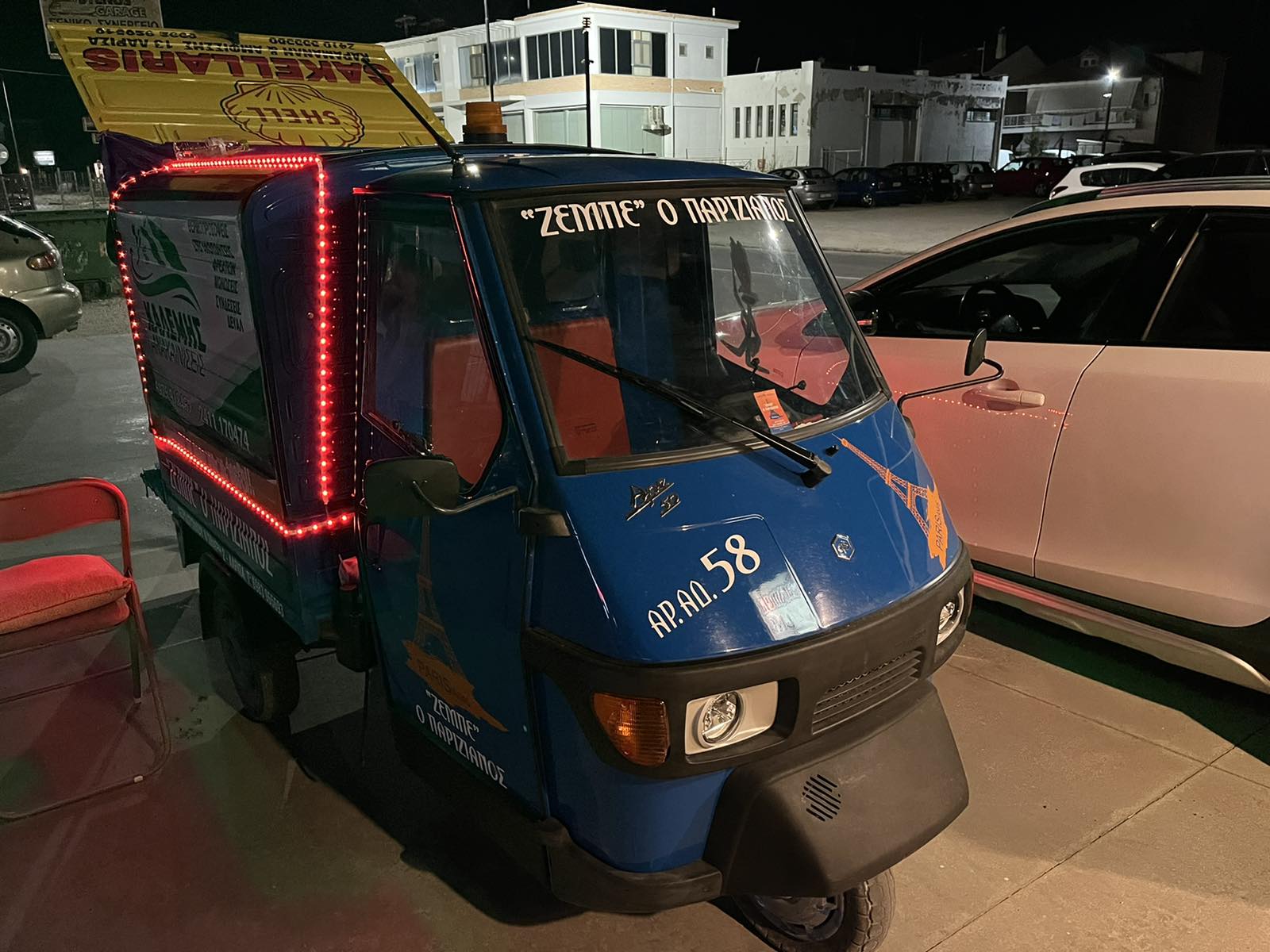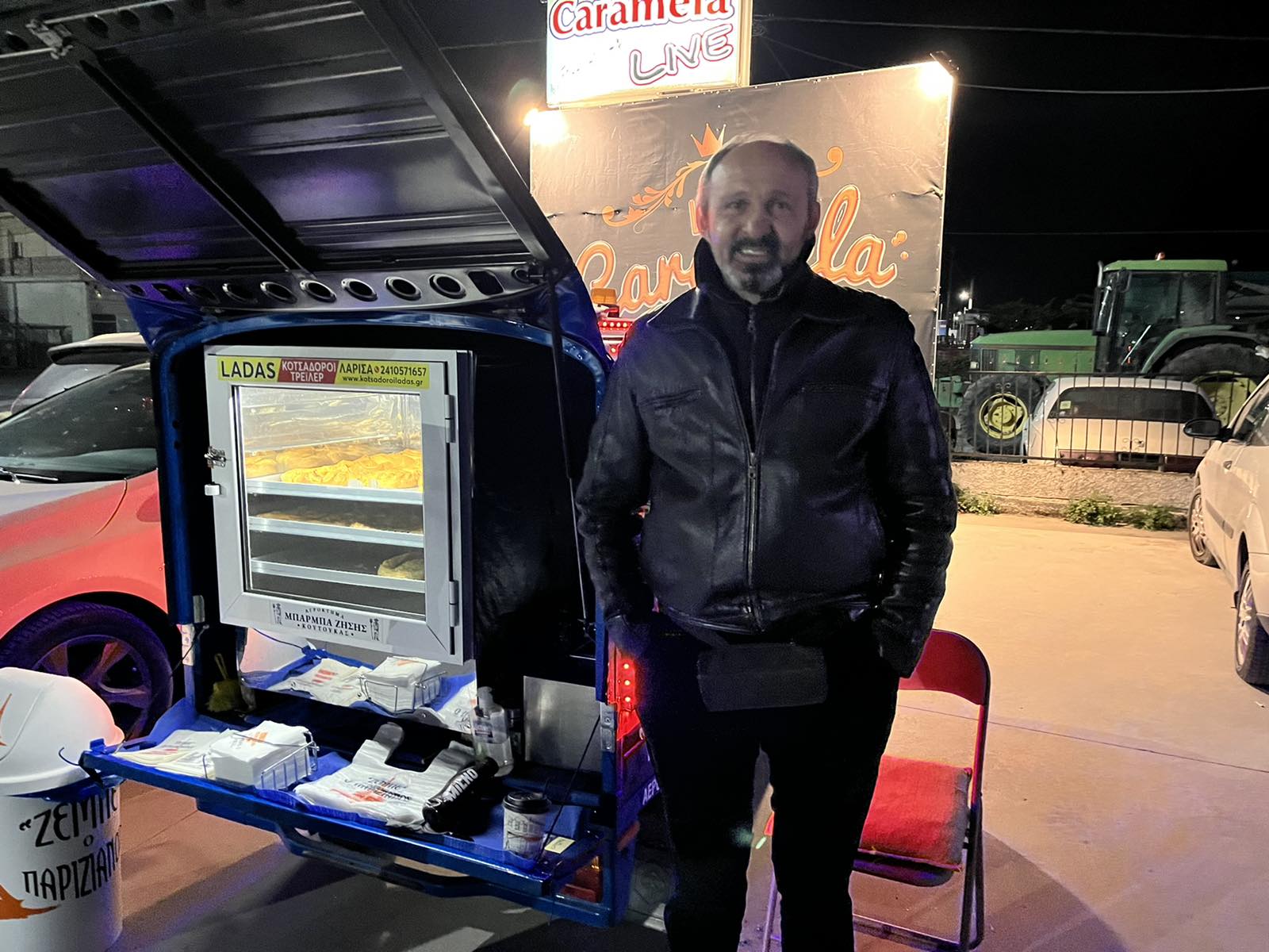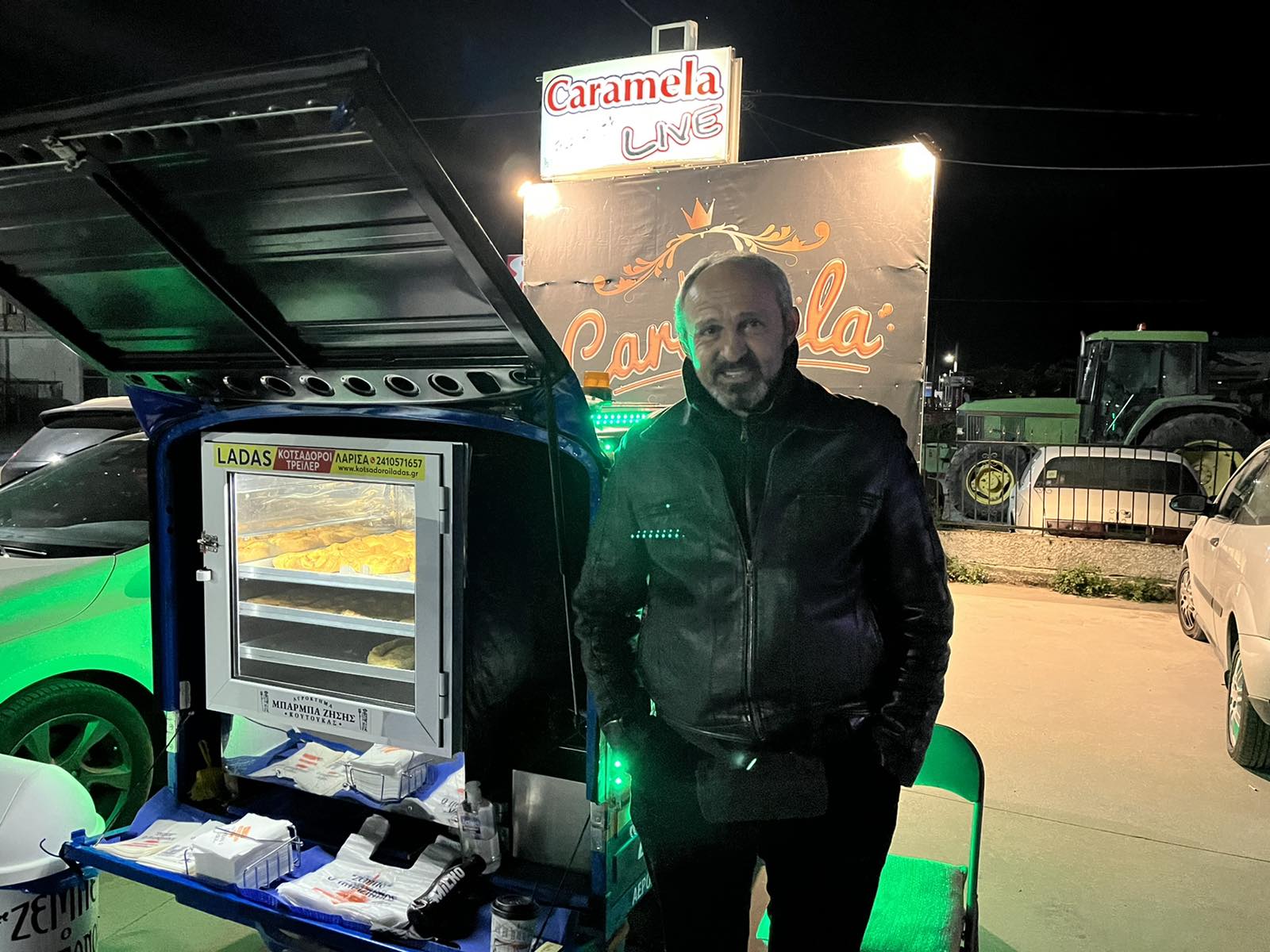 Τις νύχτες κάνει «πιάτσα» έξω από τα νυχτερινά κέντρα και ικανοποιεί την πείνα των Λαρισαίων ξενύχτηδων με τυρόπιτες, πίτσες και πεϊνερλί.