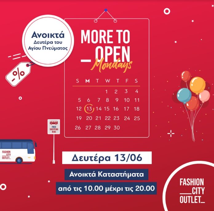 Τα καταστήματα του Fashion City Outlet θα είναι ανοικτά την Δευτέρα του Αγίου Πνεύματος από τις 10 το πρωί έως και τις 8 το βράδυ με ειδικές τιμές και ΜΕΓΑΛΕΣ ΠΡΟΣΦΟΡΕΣ που θα ισχύουν ΜΟΝΟ για την ημέρα του Αγίου Πνεύματος!