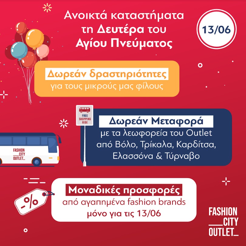 Την Δευτέρα του Αγίου Πνεύματος Δωρεάν λεωφορεία θα ξεκινήσουν στις 11 το πρωί από Βόλο, Τρίκαλα, Καρδίτσα, Ελασσόνα και Τύρναβο με προορισμό το Fashion City Outlet τον αγαπημένο εκπτωτικό προορισμό όλης της Θεσσαλίας!