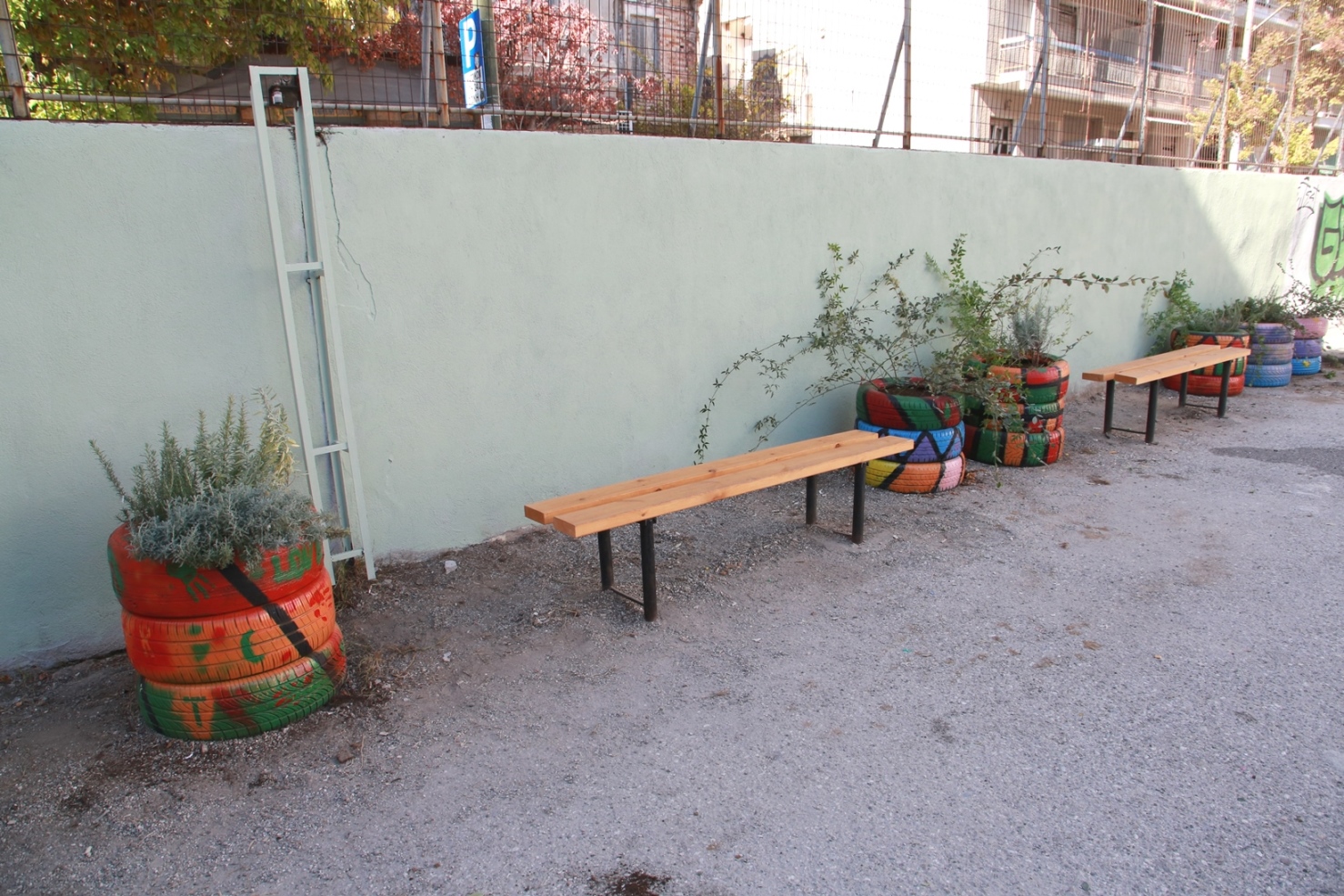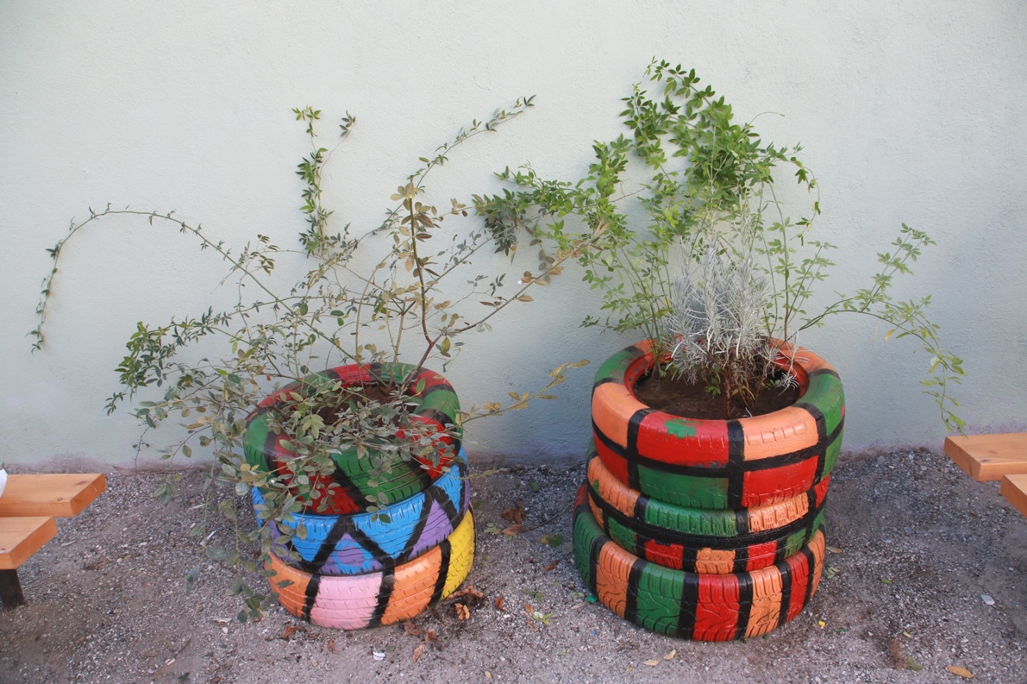 Οι μαθητές, μαζί με τους καθηγητές τους, δημιούργησαν φυτοδοχεία από τρία παλιά ανακυκλώσιμα ελαστικά, τα οποία έβαψαν με έντονα και ευφάνταστα χρώματα. Στα φυτοδοχεία τοποθετήθηκαν ειδικά εμπλουτισμένα χώματα και φυτά. Τα φυτά που χρησιμοποιήθηκαν ήταν αναρριχώμενα (όπως τριανταφυλλιές άκανθες, γιασεμιά, παρθενοκισσοί, ριχοσπέρματα), κρεμοκλαδείς θάμνοι (όπως κυδωνάστρο ορθόκλαδο και lacteus), καθώς και αρωματικά και φαρμακευτικά φυτά (όπως λεβάντα, λεβαντίνη, φασκόμηλο και δεντρολίβανο).
