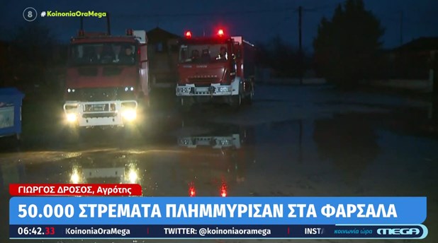 «Δυστυχώς είμαστε ξανά στο ίδιο έργο θεατές και από το 2017 και μετά βιώνουμε στο πετσί μας την κλιματική κρίση. Εκτιμώ ότι πάνω από 50.000 στρέμματα θα έχουν καλυφθεί με νερό. Η Υπέρεια Φαρσάλων εκκενώθηκε προληπτικά, ευτυχώς δεν κινδύνευσαν ζωές», είπε ο Γιώργος Δρόσος και πρόσθεσε: