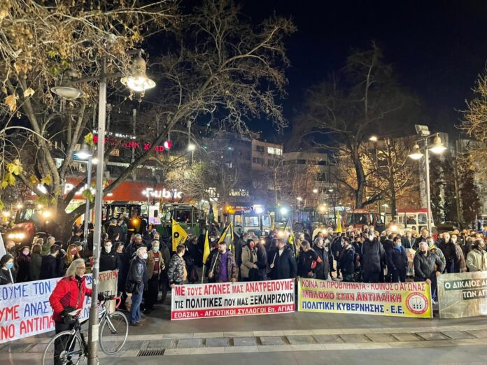 Οι αγρότες βρίσκονται στην πλατεία κρατώντας πανό των Ομοσπονδιών Αγροτικών Συλλόγων Λάρισας και Καρδίτσας και του μπλόκου της Νίκαιας και φωνάζουν συνθήματα κατά της ΚΑΠ της ΕΕ και της πολιτικής της κυβέρνησης που τους οδηγούν στη φτώχεια.
