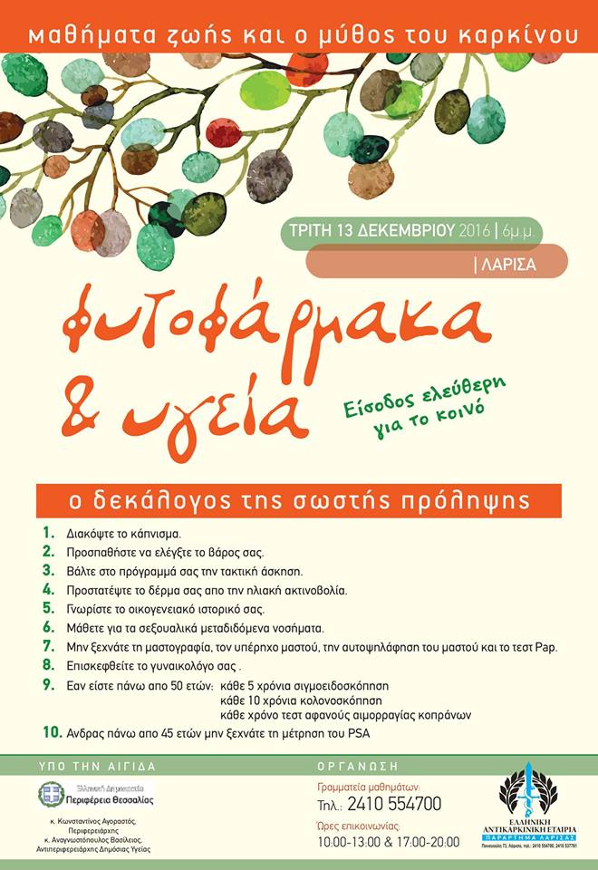 Η σωστή χρήση φυτοφαρμάκων και η υγεία είναι η πρώτη εκδήλωση που θα διεξαχθεί αύριο Τρίτη 13 Δεκεμβρίου και ώρα 18:30 στην αίθουσα εκδηλώσεων του Επιμελητηρίου Λάρισας (2ος όροφος), στο πλαίσιο του κύκλου διεξαγωγής μιας σειράς ομιλιών με τίτλο «Μαθήματα ζωής και ο μύθος του καρκίνου», που διοργανώνεται από την Ελληνική Αντικαρκινική Εταιρεία (Παράρτημα Λάρισας), τον Γεωπονικό Σύλλογο Ν. Λάρισας, το Γεωτεχνικό Επιμελητήριο Ελλάδας (Παράρτημα Κ. Ελλάδας), τον Αγροτικό Συνεταιρισμό Λαρισαίων Αγροτών και την Πανελλήνια Ένωση Νέων Αγροτών και τελούν υπό την αιγίδα της Περιφέρειας Θεσσαλίας και της Αιματολογικής Κλινικής ΠΓΝ Λάρισας. Σε συνέντευξη τύπου στην αίθουσα του Περιφερειακού Συμβουλίου τονίστηκαν τα εξής:
