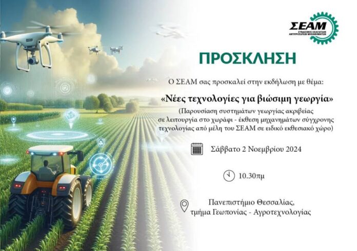Το τμήμα Γεωπονίας – Αγροτεχνολογίας του Πανεπιστημίου Θεσσαλίας και ο Σύνδεσμος Εισαγωγέων Αντιπροσώπων (ΣΕΑΜ) διοργανώνουν ανοιχτή εκδήλωση, με θέμα «Νέες τεχνολογίες για βιώσιμη γεωργία» που θα πραγματοποιηθεί στις αγροτικές εγκαταστάσεις του τμήματος Γεωπονίας και Αγροτεχνολογίας, του Πανεπιστημίου Θεσσαλίας, στη Λάρισα το Σάββατο 2 Νοεμβρίου ώρα 10:30.