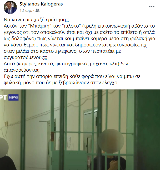 Αυτή την φορά σχολιάζοντας τις φωτογραφίες που είδαν το φως της δημοσιότητας από τον πιλότο, δολοφόνο της Καρολάιν του εγκλήματος στα Γλυκά Νερά, στη φυλακή να μιλάει στο τηλέφωνο ή να περπατάει με τους συγκρατούμενούς του, ο Λαρισαίος νομικός αναρωτιέται πως είναι δυνατό να συμβαίνουν όλα αυτά την στιγμή που όπως τονίζει: «εγώ κάθε φορά που είναι να μπω σε φυλακή, μόνο που δε με ξεβρακώνουν στον έλεγχο…».