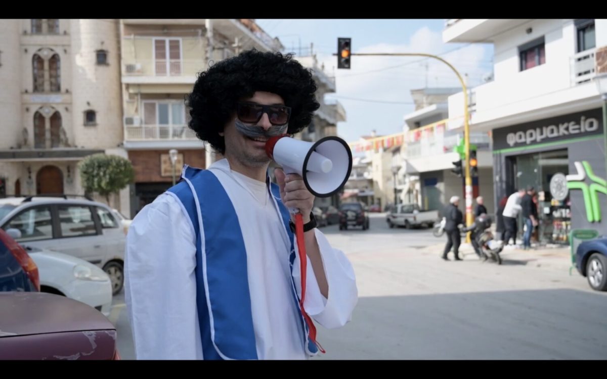 Πίσω από την παραδοσιακή αμφίεση, ο Φαρσαλινός δημοσιογράφος Γιώργος Γκαντέλος, που μας αποκαλύπτει και τις δεινές υποκριτικές του ικανότητες.