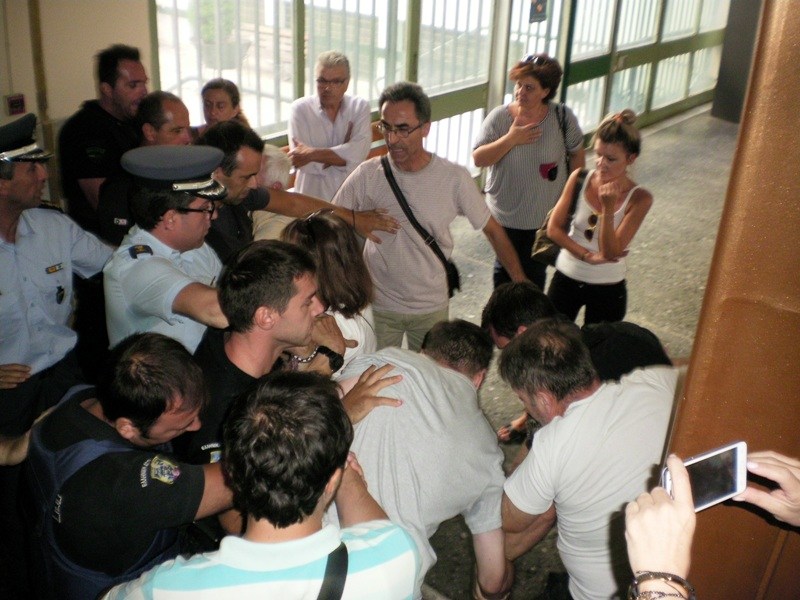 Η ένταση προκλήθηκε όταν ορισμένοι συμβολαιογράφοι επιχείρησαν να εισέλθουν στην αίθουσα και εμποδίστηκαν από τους συγκεντρωμένους, με αποτέλεσμα την επέμβαση των ανδρών της αστυνομίας.