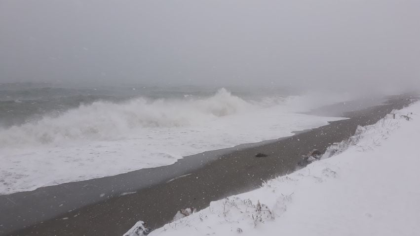 Το πυκνό χιόνι έφτασε κυριολεκτικώς μέχρι το κύμα στα παράλια της Λάρισας με το θέαμα να είναι συναρπαστικό.