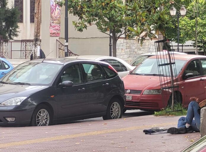 Ο άνδρας κάθισε στο πεζοδρόμιο έξω από την παιδική χαρά που βρίσκεται απέναντι από τον Ιερό Ναό παίζοντας μονότονα έναν ενοχλητικό ρυθμό με το μουσικό του όργανο, επαιτώντας χρήματα.