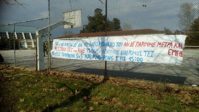 Χτες, Τρίτη 14 Μαρτίου στο ΤΕΙ Λάρισας ξεκίνησε το Τουρνουά ποδοσφαίρου 5×5, τις ομάδες καλωσόρισε ο Γιάννης Παπακώστας, μέλος του Γ.Π. Θεσσαλίας της ΚΝΕ.Σήμερα Τετάρτη 15 Μαρτίου οι αθλητικές δραστηριότητες συνεχίζονται με αγώνες Ping-Pong ενώ θα ολοκληρωθεί και το τουρνουά ποδοσφαίρου με την διεξαγωγή του τελικού. Θα πραγματοποιηθεί ομιλία από τον Ραφαήλ Κυριακόπουλο, παλαιστή και μέλος του Τ.Σ. ΤΕΙ-ΑΕΙ Λάρισας της ΚΝΕ.