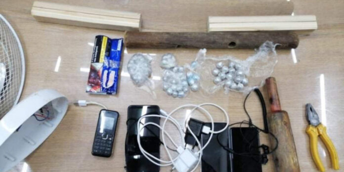 71 μπαλάκια χασίς, μικτού βάρους 78,9 γραμμαρίων, 4 κινητά τηλέφωνα, 3 φορτιστές και handsfree, 2 ρόπαλα και πένσα.