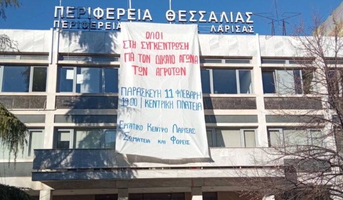 Εκπρόσωποι του Εργατικού Κέντρου Λάρισας, Σωματείων και φορέων τοποθέτησαν γιγαντοπανό στην Περιφέρεια Θεσσαλίας που καλεί για το αυριανή (11 Φεβρουαρίου) συγκέντρωση των αγροτών στην Κεντρική Πλατεία και ώρα 7:00 μ.μ. Το ΕΚΝΛ οργανώνει προσυγκέντρωση στα γραφεία του (Εργατικής Πρωτομαγιάς 6) στις 6:00μμ.