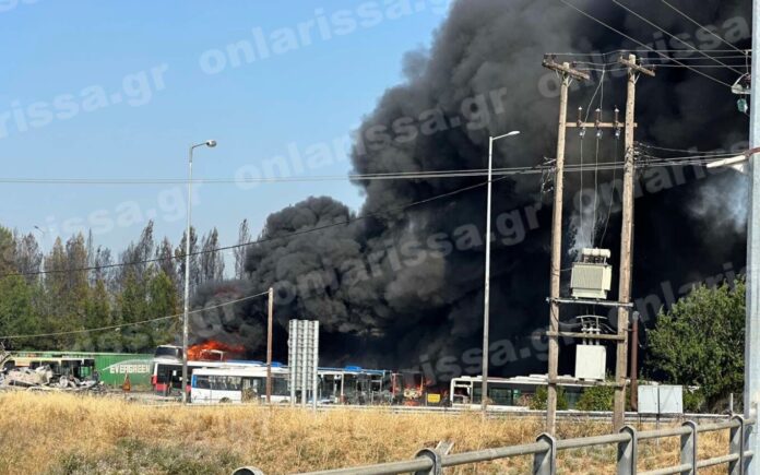 Στο σημείο καίγονται σταθμευμένα λεωφορεία και υπάρχει εκτροπή της κυκλοφορίας.