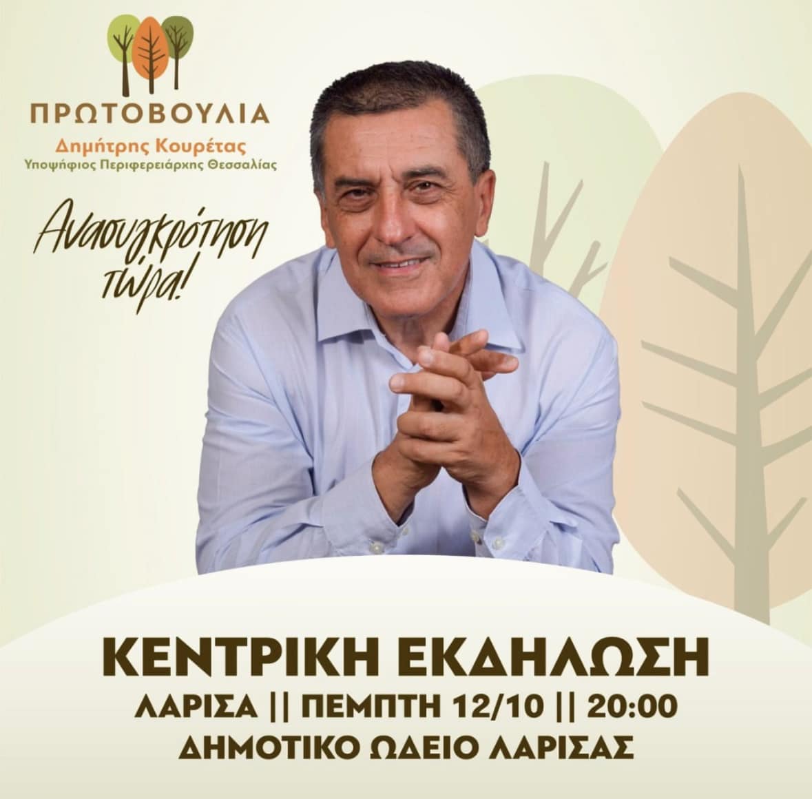 Η «Πρωτοβουλία» με επικεφαλής και υποψήφιο Περιφερειάρχη Θεσσαλίας τον κ. Δημήτρη Κουρέτα πραγματοποιεί την κεντρική της εκδήλωση, σήμερα, Πέμπτη στη Λάρισα στις 20:00, στο Δημοτικό Ωδείο.