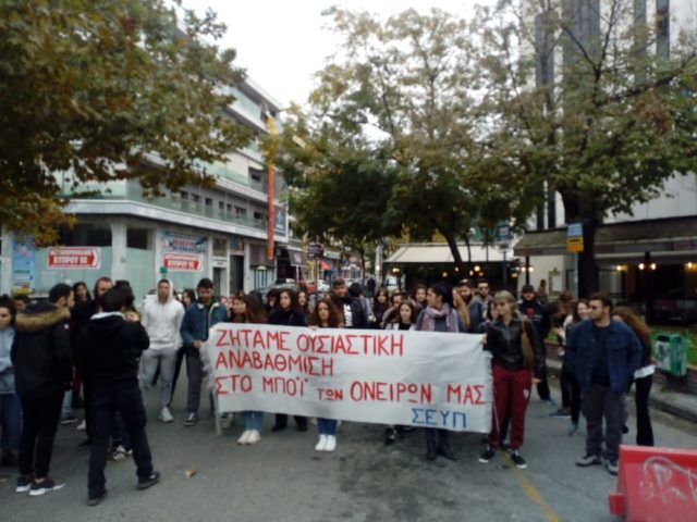 Κινητοποίηση σπουδαστών του ΤΕΙ Θεσσαλίας κατά του σχεδίου νόμου που περιλαμβάνει τη νέα αρχιτεκτονική του Πανεπιστημίου Θεσσαλίας πραγματοποιείται το πρωί της Τετάρτης στο κέντρο της Λάρισας.