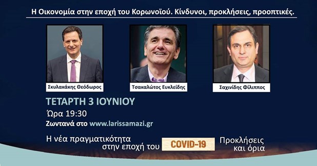 Ιδιαίτερο ενδιαφέρον προκαλεί η διαδικτυακή συζήτηση που διοργανώνει ο Δήμος Λαρισαίων, την ερχόμενη Τετάρτη 3 Ιουνίου, στο πλαίσιο της Πόλης που Μαθαίνει και του Πανεπιστημίου Πολιτών με θέμα «Η Οικονομία στην εποχή του Κορωνοιού. Κίνδυνοι προκλήσεις προοπτικές».