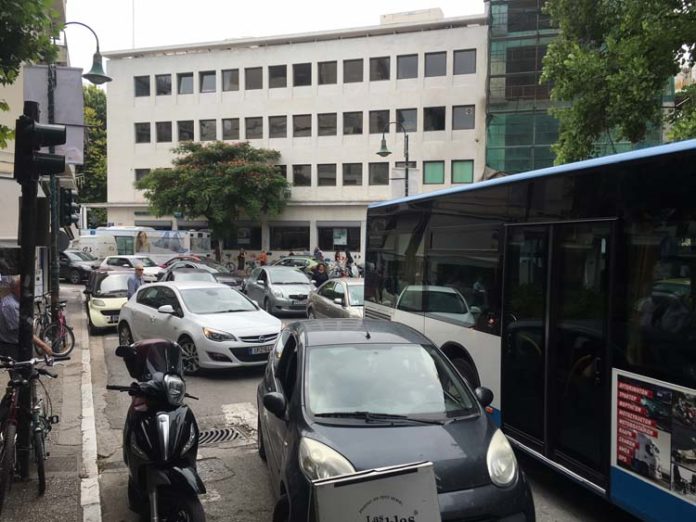 Αποτέλεσμα ήταν ο αστικό λεωφορείο να “φρακάρει” και πίσω του, όπως θα δείτε στη φωτογραφία, να εγκλωβιστούν δεκάδες αυτοκίνητα.