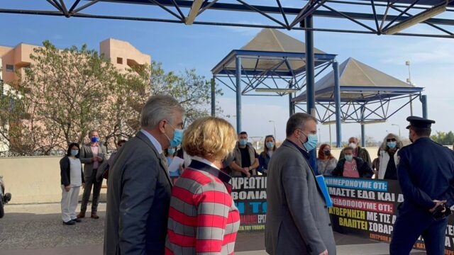 Στο σημείο βρίσκονταν εργαζόμενοι της Επιτροπής Αγώνα ΠΓΝΛ κατά του υποχρεωτικού εμβολιασμού, οι οποίοι αποδοκίμασαν την κ. Γκάγκα.