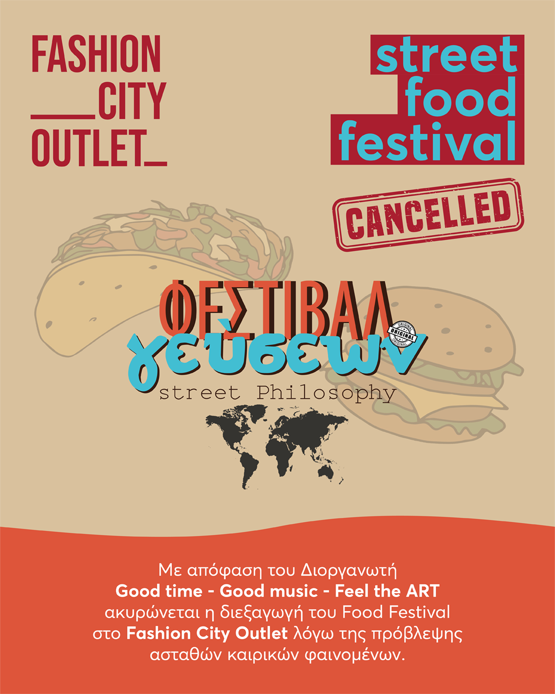 Το Food Festival, «ΦΕΣΤΙΒΑΛ γεύσεων, street Philosophy» η γευστική εμπειρία που είχε προγραμματιστεί στο Fashion City Outlet για το τετραήμερο 14 έως 17 Μαΐου δεν θα πραγματοποιηθεί.