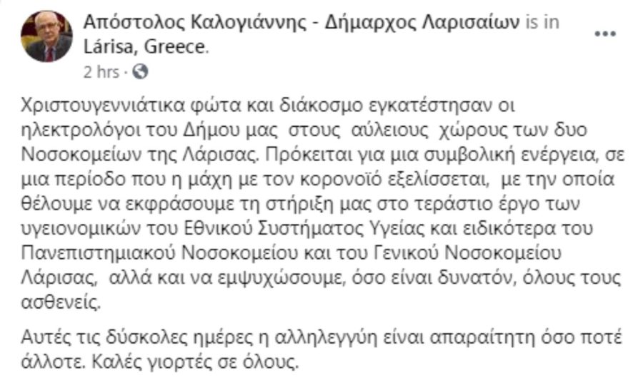 Επί του θέματος μάλιστα, ο Δήμαρχος Λαρισαίων κ. Απόστολος Καλογιάννης έκανε ανάρτηση στην προσωπική του σελίδα στο facebook, εξηγώντας ότι η επιλογή αυτή της Δημοτικής Αρχής αποτελεί “μια συμβολική ενέργεια, σε μια περίοδο που η μάχη με τον κορονοϊό εξελίσσεται, με την οποία θέλουμε να εκφράσουμε τη στήριξη μας στο τεράστιο έργο των υγειονομικών του Εθνικού Συστήματος Υγείας και ειδικότερα του Πανεπιστημιακού Νοσοκομείου και του Γενικού Νοσοκομείου Λάρισας, αλλά και να εμψυχώσουμε, όσο είναι δυνατόν, όλους τους ασθενείς”, τονίζοντας παράλληλα την ανάγκη έκφρασης αλληλεγγύης στη δύσκολη περίοδο της πανδημίας.
