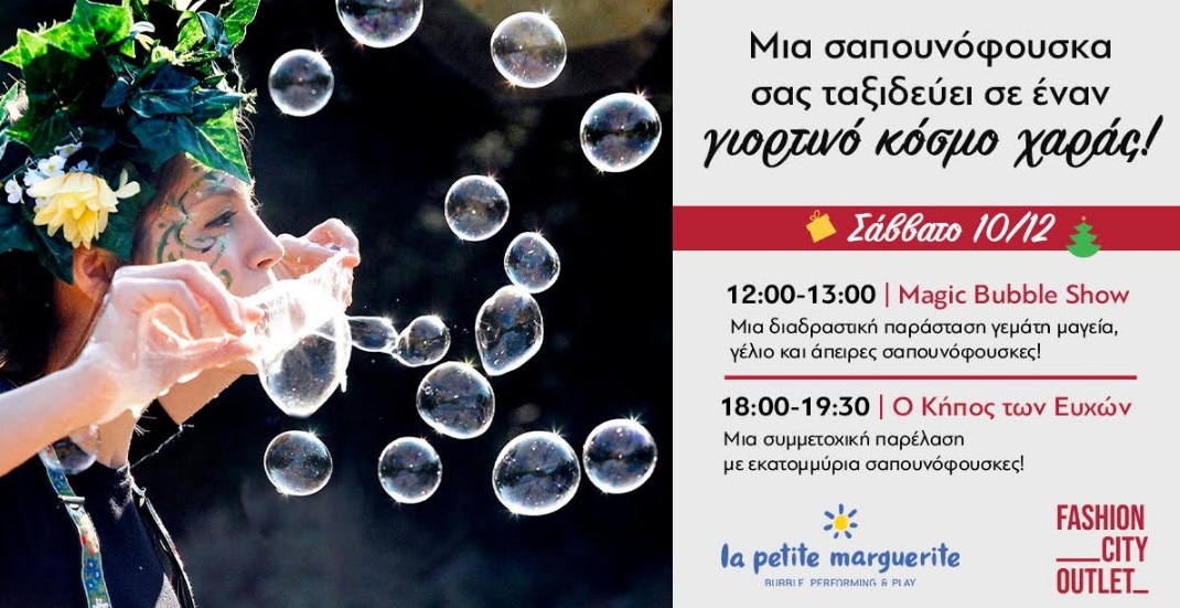 H καλλιτεχνική ομάδα La Petite Marguerite έρχεται για πρώτη φορά στο Fashion City Outlet αυτό το Σάββατο 10/12 για να σκορπίσει χαρά, χαμόγελα και πολλές πολλές σαπουνόφουσκες! Οι δύο απίθανες διαδραστικές παραστάσεις θα λάβουν χώρα πρωί και απόγευμα ως εξής: