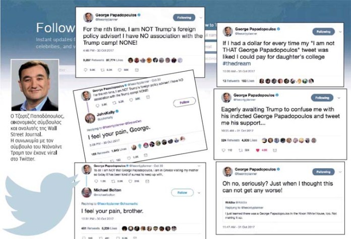Στη συνέχεια, έπιασε να απαντά στους «επικριτές» του, εξηγώντας ότι πρόκειται για απλή συνωνυμία. Τα σχόλιά του είχαν χιούμορ («ανυπομονώ πότε ο Τραμπ θα με μπερδέψει με τον κατηγορούμενο και θα μου τουιτάρει τη συμπαράστασή του») και πολύ γρήγορα άρχισαν να ξεσηκώνουν retweets. Μέχρι το τέλος Tns Δευτέρας, ο Τζορτζ Παπαδόπουλος είχε γίνει viral όπως ο «άλλος Τζορτζ Παπαδόπουλος». «Ποτέ δεν φανταζόμουν ότι θα είχαν τέτοια απήχηση τα τουίτ μου. Το αρχικό έχει 39.000 λάικ, είναι τρελά αυτά τα πράγματα», λέει γελώντας. «Ουσιαστικά αποφάσισα να αντιμετωπίσω το θέμα με τον γνωστό ελληνικό φραμπαλά και πέτυχε».
