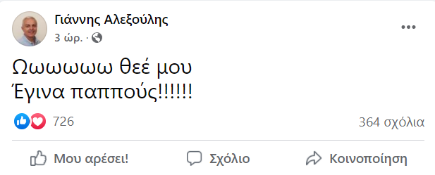 Δεν μπορεί να κρύψει την τεράστια χαρά του και δικαιολογημένα, ο αντιδήμαρχος Γιάννης Αλεξούλης και παλαίμαχος ποδοσφαιριστής της ΑΕΛ, με το γεγονός ότι πριν μερικές ώρες έγινε παππούς από την πρωταθλήτρια του στίβου (άλμα εις μήκος), κόρη του, Λίλη Αλεξούλη.