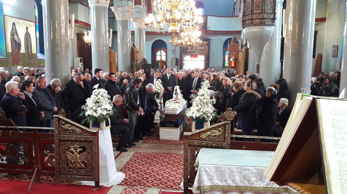 Η σορός του έφτασε στην εκκλησία της Παναγίας Φανερωμένης, όπου εψάλει η νεκρώσιμη ακολουθία, με τη συνοδεία της Φιλαρμονικής του δήμου που παιάνιζε πένθιμα εμβατήρια και πλήθος κόσμου που τη συνόδευε πεζή στην εκκλησία.
