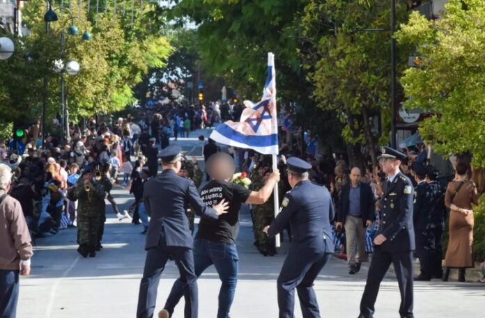 Αναστάτωση στη Λάρισα, στην παρέλαση της 28ης Οκτωβρίου. Ένας άντρας προσπάθησε να πλησιάσει την εξέδρα των επισήμων με μια σημαία του Ισραήλ που είχε βάψει με κόκκινο χρώμα…