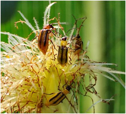 Το έντομο προσβάλει κυρίως τον αραβόσιτο και έχει 1 γενιά/έτος. Οι προνύμφες προσβάλουν το ριζικό σύστημα (Μάιο – Ιούνιο) με αποτέλεσμα τα φυτά να μην μπορούν να στηριχτούν και να πλαγιάζουν (εικόνα 1). Τα ενήλικα έχουν μήκος 5-6 mm (εικόνα 2) και τρέφονται στα φύλλα (εικόνα 3) και στα μετάξινα νημάτια των σπαδίκων κατά την άνθιση (εικόνα 4), προκαλώντας μειωμένα ποσοστά γονιμοποίησης και σημαντικές απώλειες στην παραγωγή (εικόνα 5)».