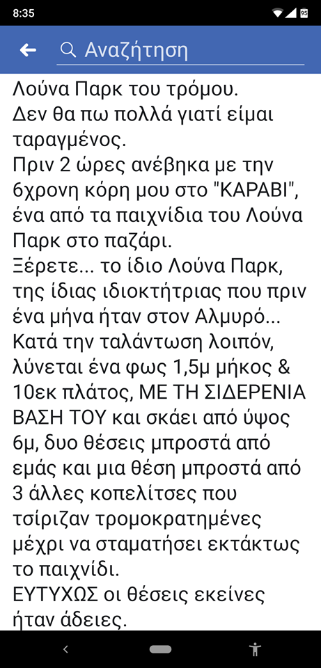 Σύμφωνα με γονέα 6χρονης την ώρα που το παιχνίδι ήταν σε κίνηση έπεσε ένα αντικείμενο σε απόσταση αναπνοής. Στην ανάρτησή του γράφει στο facebook