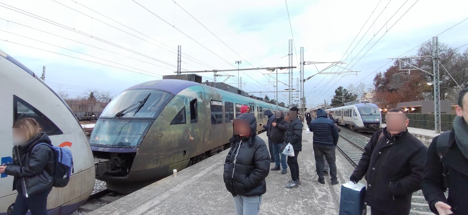 Το δεύτερο δρομολόγιο του προαστιακού, το οποίο προτίμησαν για τον παραπάνω λόγο οι περισσότεροι επιβάτες, έφτασε στην ώρα του, οι επιβάτες και των δύο δρομολογίων (5:30 και 7:15) επιβιβάστηκαν κανονικά και μετά από 5 λεπτά ανακοινώθηκε ότι έπρεπε να κατέβουν για να αλλάξει γραμμή η αμαξοστοιχία. Μέσα στο κρύο έκπληκτοι και παγωμένοι παρακολούθησαν απίστευτες σκηνές να εκτυλίσσονται. Η αμαξοστοιχία των 7:15 άλλαξε γραμμή και «κόλλησε» μετά από πολλές προσπάθειες με τη χαλασμένη αμαξοστοιχία των 5:30. Το αποτέλεσμα ήταν να βραχυκυκλώσει και αυτή και να ακινητοποιηθούν κολλημένες και οι δύο. Το σκηνικό συμπλήρωσε αυτοκινητάμαξα που έφτασε σε άλλη γραμμή, αλλά κανείς δεν μπορούσε να ενημερώσει τους ταλαίπωρους επιβάτες αν θα τους μεταφέρει στον προορισμό τους…»