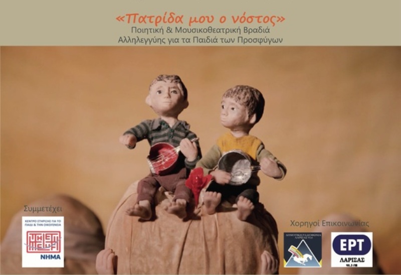Μια ποιητική και μουσικοθεατρική βραδιά αλληλεγγύης για τα παιδιά των προσφύγων, με τίτλο «Πατρίδα μου ο νόστος», διοργανώνεται την Πέμπτη 1 Δεκεμβρίου 2016 και ώρα 19.00μμ στο «Χατζηγιάννειο» Πνευματικό Κέντρο Λάρισας, από το project PRESS του Ελληνικού Ανοικτού Πανεπιστημίου (Ε.Α.Π.) και τον Δήμο Λαρισαίων.