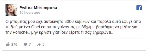 Η Πωλίνα Μητσιμπόνα σχολίασε την συζήτηση που έχει ξεσπάσει γύρω από το φρικιαστικό πολύνεκρο τροχαίο με την Πόρσε και έγραψε: «Ο μπαμπάς μου είχε αυτοκίνητο 3000 κυβικών και παρόλα αυτά έφυγε από τη ζωή με ένα Opel corsa πηγαίνοντας με 85χλμ βαρέθηκα να μιλάτε για την Porsche.. μην κρίνετε γιατί δεν ξέρετε τι σας ξημερώνει..».