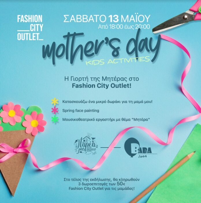 Ψωνίζουμε με άνεση, δίνοντας την ευκαιρία στα παιδιά μας να παίξουν στους χώρους του Fashion City Outlet και να διασκεδάσουν με τις παιδικές δραστηριότητες που κάνουν την κάθε μέρα γιορτή για τους μικρούς μας φίλους. Αυτό το Σάββατο 13 Μαΐου, η «γιορτή της Μητέρας» κινητοποιεί τα παιδιά και τα διασκεδάζει σε συνεργασία με τα κέντρα δημιουργικής απασχόλησης «Η παρέα μας» και «Babaloon».