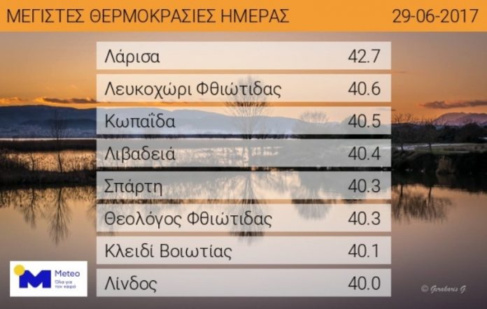 Σύμφωνα με το έγκυρο μετεωρολογικό site meteo.gr, η πρωτεύουσα του θεσσαλικού κάμπου κατέγραψε σήμερα την υψηλότερη θερμοκρασία στη χώρα, καθώς το θερμόμετρο έφτασε τους 42,7 βαθμούς Κελσίου.