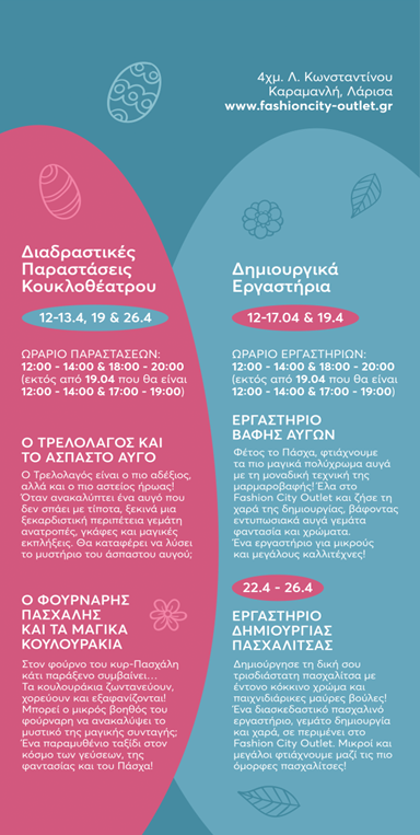 «Άρωμα Πάσχα» πλημμύρισε τους διαδρόμους του Fashion City Outlet που «έβαλε τα γιορτινά του» και μας περιμένει στολισμένο για να κάνουμε τις αγορές μας με άνεση καθώς και να διασκεδάσουμε στον «Λουλουδένιο Πασχαλόκηπο» με δημιουργικά εργαστήρια και διαδραστικές παραστάσεις κουκλοθέατρου.