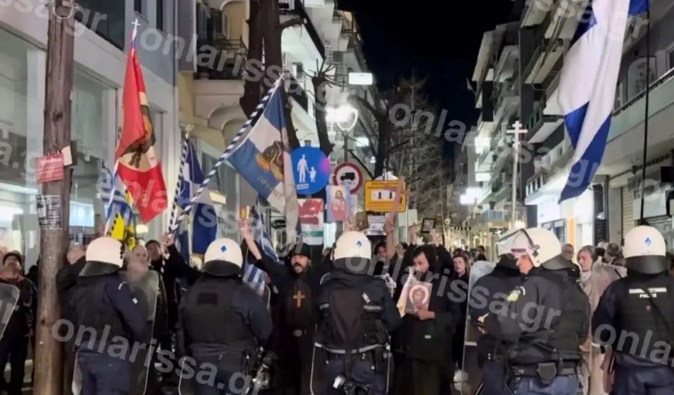 Κρατώντας ελληνικές σημαίες και χριστιανικές εικόνες και τραγουδώντας ψαλμωδίες και τον εθνικό ύμνο, δεκάδες ένθερμοι χριστιανοί και ρασοφόροι, διαμαρτυρήθηκαν το βράδυ του Σαββάτου (22.03.2025) έξω από το χώρο στη Λάρισα όπου είναι προγραματισμένη να ανέβει η παράσταση του Χριστόφορου Ζαραλίκου που τιτλοφορίεται «Και εγώ υπάλληλος είμαι».