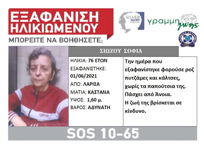 Η Σοφία Σιώζου 76 χρόνων, που πάσχει από άνοια, εξαφανίστηκε την Τρίτη 1 Ιουνίου από το σπίτι της στη Λάρισα.