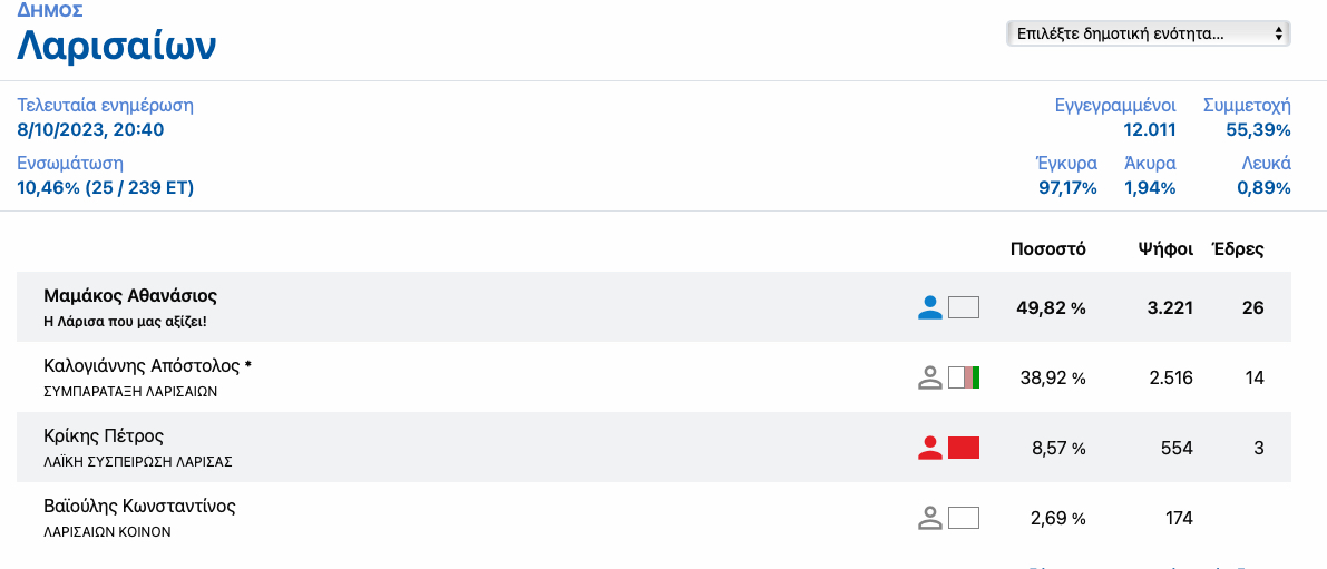 Σημαντικό προβάδισμα της τάξης περίπου του 11% έχει ο Θανάσης Μαμάκος έναντι του Απόστολου Καλογιάννη στον Δήμο Λαρισαίων, στο 10,46% των αποτελεσμάτων.