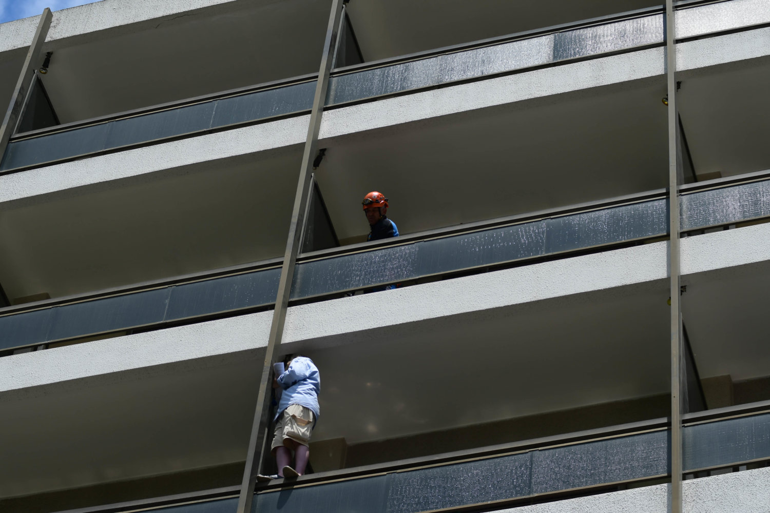 Για τη διάσωσή της στήθηκε μεγάλη επιχείρηση από τις αρχές, με την Πυροσβεστική να τοποθετεί δίχτυ ασφαλείας, την ώρα που ειδικός διαπραγματευτείς προσπαθούσε να την πείσει να κατέβει από το περβάζι του μπαλκονιού.