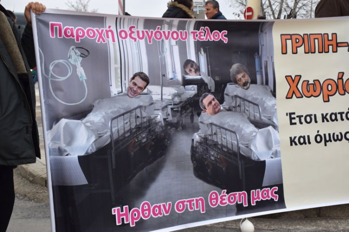 Το καραβάνι περπάτησε όλους τους δρόμους της πόλης σταμάτησε στη Γέφυρα του Πηνειού και πέταξαν πλακάτ με τον υπουργός Υγείας, Ανδρέας Ξανθός και το υφυπουργό Παυλο Πολάκη.