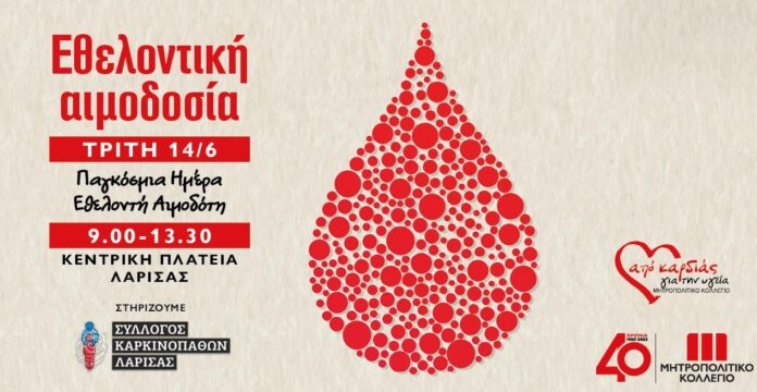 Με στόχο την ευαισθητοποίηση και την ενημέρωση της τοπικής κοινωνίας σχετικά με τη σημασία της εθελοντικής αιμοδοσίας, αλλά και την προσέλκυση νέων εθελοντών αιμοδοτών, το Μητροπολιτικό Κολλέγιο, το μεγαλύτερο Κολλέγιο Πανεπιστημιακών Σπουδών στην Ελλάδα, διοργανώνει εθελοντική αιμοδοσία στην κεντρική πλατεία Λάρισας, την Τρίτη 14 Ιουνίου, και ώρες 09:00 – 13:30. Η δράση πραγματοποιείται με αφορμή την Παγκόσμια Ημέρα Εθελοντή Αιμοδότη και είναι ανοιχτή για όλους.