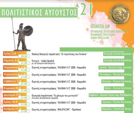 Πλούσιος σε εκδηλώσεις – τηρουμένων των συνθηκών με την πανδημία – θα είναι και φέτος ο «Πολιτιστικός Αύγουστος 2021» που διοργανώνει ο Οργανισμός Πολιτισμού Αθλητισμού Κοινωνικής Προστασίας Αλληλεγγύης του δήμου Φαρσάλων.